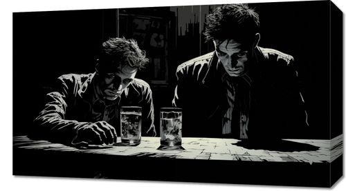 Obraz z serii abstrakcja zatytułowany Spiskowcy. Ta grafika przedstawia dwóch mężczyzn zanurzonych w głębokiej konwersacji przy barowym stole. Stylizacja na czarno-biało uchwyciła napięte, dramatyczne oświetlenie i cienie, które nadają scenie klimat tajemniczości i suspensu. Wyraźne kontury i kontrastowe światłocienie podkreślają wyraziste postaci mężczyzn i ich zacięte postawy. Obraz ten przemawia do miłośników klasycznego kina i literatury, doskonale nadając się do dekoracji przestrzeni o męskim charakterze, takich jak prywatne gabinety, domowe bary czy miejsca spotkań.