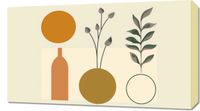 Obraz z serii boho zatytułowany Symfonia Równowagi. Obraz łączy organiczne kształty roślin z rygorystyczną formą geometrii. Prezentuje on wazony w spokojnych odcieniach brązu i złota, z których jeden jest ozdobiony gałązkami z delikatnymi pąkami, a drugi pokazuje symetryczny wzór liści. Proste linie i figury geometryczne, takie jak okrąg i prostokąt, tworzą tło dla roślinności, przypominając o ludzkiej próbie ujarzmienia natury. Całość osadzona na pastelowym tle wywołuje uczucie spokoju i harmonii. To dzieło będzie pasowało do przestrzeni, które cenią równowagę między naturą a stworzonym przez człowieka porządkiem, jak eleganckie gabinety, przestrzenie wellness lub strefy odpoczynku, które dążą do stworzenia oazy spokoju w zabieganym świecie.