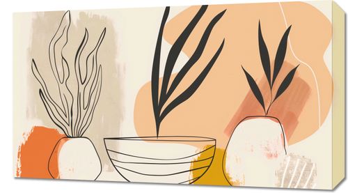 Obraz z serii boho zatytułowany Szkice Botaniczne. Na obrazie przedstawiono stylizowane rośliny o delikatnych, ale wyrazistych konturach w dwóch kontrastujących doniczkach, które stanowią centralny punkt kompozycji. Tło, składające się z abstrakcyjnych kształtów i pociągnięć pędzla w ciepłej palecie barw - od terrakoty do bladego koralu - zapewnia przyjemny kontrast dla czarnych linii roślin. Minimalistyczny charakter ilustracji, w połączeniu z organicznymi formami i neutralnymi barwami, sprawia, że jest to idealny element do wnętrz, które cenią prostotę i spokój, takich jak nowoczesne biura, jadalnie czy salony, gdzie może wprowadzić lekkość i świeżość wizualną.