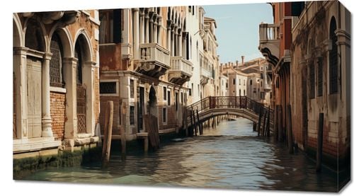 Obraz z serii pejzaże zatytułowany Wenecjańska Uroda, obraz ukazuje spokojny kanał w Wenecji, gdzie woda płynie leniwie, odzwierciedlając zabytkowe fasady wąskich domów. Delikatne światło rozlewa się po kanałach, a mały, kamienny most łączy ze sobą dwie tajemnicze ulice, dodając scenie romantycznego uroku. Ta idylliczna sceneria przenosi widza do serca włoskiej elegancji, pełnej historii i spokoju. Idealny do zawieszenia w przestrzeniach, które cenią klasykę i subtelne piękno, takich jak eleganckie salony, tradycyjne restauracje czy hotelowe lobby.