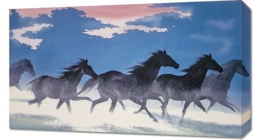 Obraz z serii abstrakcja zatytułowany Wolność i Swoboda.Przedstawione na obrazie sylwetki koni są zarysowane na tle zachodzącego słońca, które barwi niebo w odcienie różu i błękitu, tworząc kontrast z ich ciemnymi postaciami. Drobne kropki tworzą iluzję kurzu unoszącego się pod ich kopytami, co dodaje scenie żywotności i ruchu. Ten obraz jest hołdem dla surowej siły i gracji koni oraz dla wolności, którą one symbolizują. Doskonale sprawdzi się jako wyrazisty element dekoracyjny w pomieszczeniach o różnorodnym wystroju, od nowoczesnych biur po rustykalne przestrzenie mieszkalne, dodając im charakteru i inspiracji.