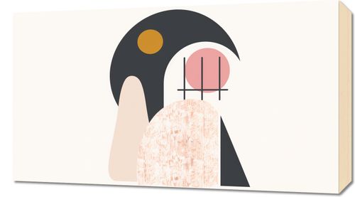Obraz z serii boho zatytułowany Zakres Widoku.Obraz przedstawia abstrakcyjną kompozycję łączącą kształty zakrzywione i geometryczne, wykorzystującą miękką i spójną paletę kolorów. Dominujące kolory to czarny, odcienie różu, beż oraz akcent żółtego, tworząc poczucie równowagi i nowoczesnej estetyki. Kompozycja składa się z nakładających się form, w tym dużej czarnej figury z wycięciem koła, przez które prześwituje część różowego koła, oraz żółtego koła umieszczonego w obszarze czarnym, co może sugerować ciało niebieskie typu księżyc lub słońce. Obecne są również elementy fakturalne, dodające głębi i intrygi jednemu z kształtów, a proste linie przecinają różowe koło, przyczyniając się do wizualnego zainteresowania dziełem. Całość kompozycji przekazuje spokojne i współczesne wrażenie, prawdopodobnie czerpiąc inspirację z natury i sztuki abstrakcyjnej.