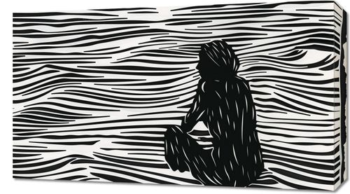 Obraz z serii abstrakcja zatytułowany Złożone Fluidalne Linie. Plakat przedstawia abstrakcyjną, czarno-białą ilustrację, w której kontrastowe, fluidalne linie tworzą efekt wzburzonej powierzchni wody. Na tej dynamicznie zarysowanej powierzchni wyłania się sylwetka osoby, która siedzi w skupieniu, z głową zwróconą w stronę obserwatora. Postać jest zredukowana do ciemnych, monochromatycznych bloków, co nadaje jej minimalistyczny, ale wyrazisty charakter. Sylwetka człowieka jest wyraźnie zarysowana i stanowi centralny punkt kompozycji, a jej kontury płynnie wtapiają się w abstrakcyjne tło. Ten artystyczny obraz łączy prostotę z głębią, sugerując kontemplację lub introspekcję. Jego prosta paleta barw i silne linie mogą przyciągać uwagę i inspirować do refleksji nad spokojem i złożonością ludzkiej natury.