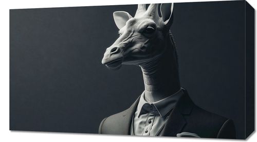 Obraz z serii pop art zatytułowany Żyrafa na Wyjściu. Przedstawia on surrealistyczny portret żyrafy ubranej w klasyczny garnitur, który jest kwintesencją połączenia dzikości natury z ludzką formalnością. Mieniąca się gra światłocienia na twarzy żyrafy dodaje portretowi głębi i tajemniczości, podczas gdy starannie dopasowany garnitur podkreśla nietypową prezencję postaci. Neutralne tło pozwala na pełne skupienie na centralnej postaci, a monochromatyczna paleta barw uwypukla detale i tekstury. Ten obraz idealnie sprawdzi się jako odważny akcent w nowoczesnych biurach, przestrzeniach kreatywnych, czy nawet w domowym gabinecie, wprowadzając element dyskusji i refleksji na temat konwencji i indywidualności.