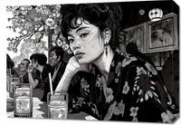 Obraz z serii motywy wschodnie zatytułowany Czarne Kimono. Przedstawia on czarno-białą scenę w restauracji, w której centralną postacią jest młoda kobieta o intensywnym spojrzeniu, ubrana w tradycyjny, kwiecisty kimono. Jej postać wyróżnia się na tle pozostałych gości, a szczegółowa grafika podkreśla wyraźne detale jej stroju i delikatnych rysów twarzy. Tło, zdobione motywem kwiatowym, nadaje głębi i kontekstu kulturowego, a całość kompozycji wywołuje atmosferę introspekcji i spokoju. Ten obraz idealnie nadaje się do wnętrz, które chcą oddać hołd klasycznej estetyce Dalekiego Wschodu lub po prostu wprowadzić element zastanowienia i piękna. Doskonale wpasuje się w przestrzenie takie jak salon, gabinet, a nawet miejsca publiczne, które pragną zapewnić swoim gościom wizualny odpoczynek i chwilę zadumy.