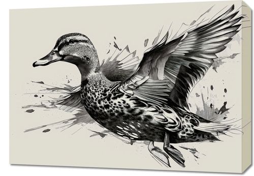 Obraz z serii wnętrza zatytułowany Gracja Kaczki w Locie, prezentuje dynamiczne ujęcie kaczki w momencie rozpościerania skrzydeł. W monochromatycznej palecie barw, z dominującymi odcieniami szarości, szczegółowe pióra kaczki zostały wykonane z wyrafinowaną precyzją, nadając każdemu pióru odrębną teksturę. Tło plakatu, które tworzy abstrakcyjne, inkwizycyjne plamy, podkreśla ruch i lekkość lotu ptaka, przywodząc na myśl spontaniczność sztuki ulicznej. Obraz wyraża wolność i nieokreśloność, doskonale komponując się w przestrzeniach nowoczesnych, minimalistycznych lub tych, które czerpią z natury inspirację, takich jak gabinety przyrodnicze, przestrzenie edukacyjne czy salony z elementami ekodesignu.