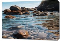 Obraz z serii pejzaże Harmonia Przybrzeżna przedstawia idylliczną scenę nadmorskiego krajobrazu, gdzie spokojne, krystalicznie czyste wody delikatnie odbijają skaliste wybrzeże. Skały pokryte morskimi wodorostami i okrągłe kamienie na pierwszym planie stanowią kontrast dla miękkiej tekstury wody. To artystyczne dzieło przypomina o naturalnej elegancji i spokoju, jakie można znaleźć w naturze. Obraz doskonale wpasuje się w przestrzenie pełne naturalnego światła i organicznych elementów, takie jak salon z widokiem na morze, gabinet relaksacyjny, czy przestrzeń wellness w luksusowym hotelu czy spa.