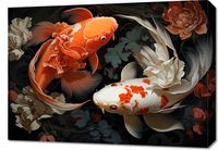 Obraz z serii motywy wschodnie zatytułowany Harmonijny Taniec to arcydzieło, które wyraża subtelność i równowagę przez harmonijne współistnienie natury i sztuki. Dwie ryby koi, jedna w odcieniach płomiennego pomarańczu, druga w pastelowych barwach kremu z akcentami czerwieni, są przedstawione w eleganckim tańcu, który jest tak płynny i gracji jak ruchy baletnicy. Ich delikatne płetwy przypominają falujące tkaniny, unoszące się w wodnym balecie, otoczone przez misternie malowane kwiaty, które dodają całości organicznej głębi. To zmysłowe i prowokujące do refleksji dzieło, które doskonale uzupełni każde wyrafinowane wnętrze, od stylowych kawiarni po intymne przestrzenie prywatne, gdzie design łączy się z naturalnym pięknem.