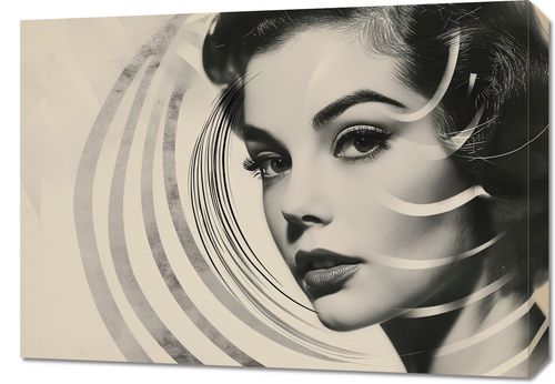 Obraz z serii pop art zatytułowany Ikonka Kina. Przedstawia czarno-białe portretowe zdjęcie klasycznej gwiazdy filmowej, której twarz jest częściowo zakryta przez geometryczny wzór spiralnych linii. Linie te dodają obrazowi dynamiki i nowoczesnego akcentu, kontrastując z retro estetyką portretu. Ten obraz łączy stare z nowym, sugerując zarówno ponadczasową piękność, jak i współczesne spojrzenie na sztukę. Idealny do eleganckich, miejskich przestrzeni lub jako dekoracja dla miłośników klasycznego kina.