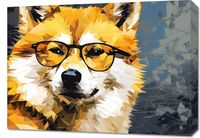 Obraz z serii pop art zatytułowany Intelektualny Psiak - wyrafinowany portret psa wykonany w stylu low poly, który jest artystycznym połączeniem nowoczesnej grafiki i dzikiego ducha natury. Pomarańczowe, białe i czarne wielokąty tworzą wizerunek psa z charakterystycznymi okularami, nadając mu wygląd pełen inteligencji i wyrafinowania. Mroczne tło z abstrakcyjnymi elementami dodaje głębi i kontrastu, wyróżniając głównego bohatera. Ten obraz to idealne odzwierciedlenie połączenia natury z kulturą miejską, świetnie nadające się do dekoracji nowoczesnych przestrzeni takich jak kawiarnie, księgarnie, czy domowe biura osób ceniących unikalny design i przyrodnicze motywy.