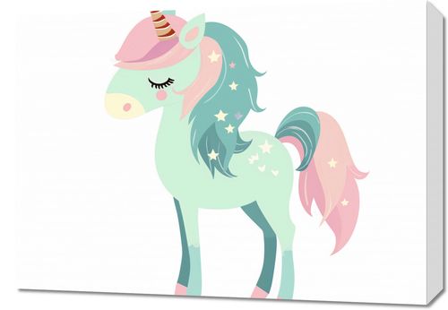 Obraz z serii wnętrza zatytułowany Jednorożec Marzeń. Na tej zachwycającej ilustracji przedstawiono pastelowego jednorożca, którego turkusowe ciało pokryte jest subtelnymi gwiazdkami, a jego miękka, różowa grzywa delikatnie opada. Zamknięte oczy i łagodny uśmiech dodają uroku tej mitycznej istocie, wprowadzając element spokoju i radości. Obraz idealnie nadaje się do pokoju dziecięcego lub innej przestrzeni przeznaczonej dla dzieci, tworząc atmosferę bajkowej krainy pełnej czarów i cudów. Delikatne kolory i uroczy wzór są doskonałe, aby rozbudzić wyobraźnię i dodać uroku każdemu wnętrzu, zachęcając do marzeń i optymizmu.