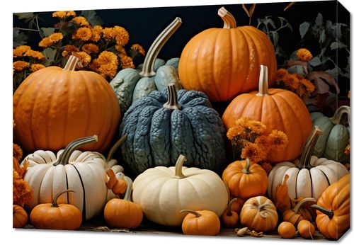 Obraz z serii natura zatytułowany Jesienne Urodzaje przedstawia bujne bogactwo jesieni. Centralne miejsce zajmuje soczysta, pomarańczowa dynia, królowa jesieni, otoczona przez różnorodność jej barwnych odmian. Niebieskawe i białe dynie tworzą wyjątkowy kontrast, a wszystko to uzupełnione jest przez złociste i burgundowe chryzantemy, które dodają kompozycji ciepła i głębi. Całość osadzona jest na tle w klasycznych, ciemnych odcieniach, co podkreśla elegancję i dojrzałość sezonu. Obraz ten idealnie wpasuje się w przestrzeń kuchni lub jadalni, dodając jej charakteru oraz ciepłego, domowego klimatu. Doskonale odnajdzie się także w przestrzeniach takich jak winiarnie czy restauracje serwujące sezonowe dania, gdzie podkreśli bogactwo i obfitość jesiennej palety smaków.