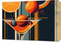 Obraz z serii abstrakcja zatytułowany Koktajl w Stylu. Obraz przedstawia stylizowaną, nowoczesną kompozycję z motywem koktajlu i owoców w stylistyce art deco. Na pierwszym planie widnieje kieliszek Martini z dwoma oliwkami na wykałaczce, zanurzonymi w pomarańczowym napoju. Tło jest geometryczne, z liniowymi i okrągłymi formami, przypominającymi cytrusy - pomarańcze i limony, które są ukazane w przekroju, ożywiając scenę swoimi soczystymi barwami. Dominują odcienie pomarańczu, żółci i głębokiego granatu, co nadaje dziełu wyrafinowany i elegancki charakter. Wszystko to osadzone jest na ciemnoniebieskim tle z subtelnie dodanymi abstrakcyjnymi formami, które mogą symbolizować gwiazdy lub bąbelki, dodając kompozycji lekkości i efektu efervescent.