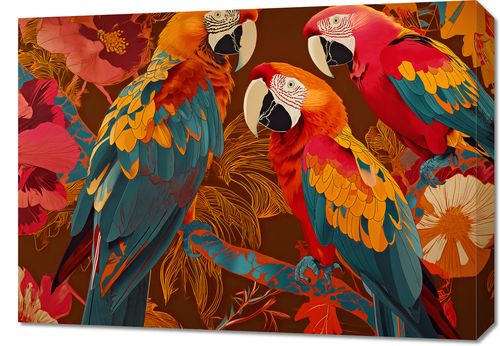 Obraz z serii abstrakcja zatytułowany Kolorowe Ary ukazuje grupę majestatycznych papug ara, których pióra w odcieniach głębokiego błękitu, gorącej pomarańczy i intensywnej czerwieni są ukazane z imponującym detalami. Ptaki są umieszczone na tle tropikalnych kwiatów i liści, tworząc barwną kompozycję, która przykuwa wzrok i przenosi obserwatora w odległe, egzotyczne krajobrazy. Dynamika i życie płynące z tego dzieła sprawiają, że jest ono idealnym wyborem dla pomieszczeń pełnych energii i pasji, takich jak kreatywne przestrzenie pracy, eklektyczne salony lub przestronne lobby hotelowe. Obraz ten celebruje różnorodność i piękno natury, przemawiając do tych, którzy cenią sobie przyrodę i kolor w swoim otoczeniu.