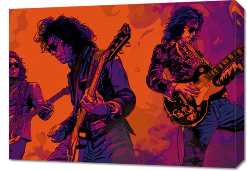 Obraz z serii pop art zatytułowany Mamy To Flow. Obrazuje trzech gitarzystów zanurzonych w pasji muzyki, z instrumentami w rękach, oddając ducha rock'n'rolla. Intensywne kolory, w tym głębokie odcienie pomarańczu i fioletu, tworzą tło, które pulsują energią i rytmem. Obraz oddaje esencję koncertowej atmosfery i jest hołdem dla klasycznych rockowych wirtuozów. Znakomicie wpasuje się w przestrzenie kulturalne, takie jak sale koncertowe, studia muzyczne, jak również jako żywiołowy akcent dekoracyjny w młodzieżowych pokojach czy salonach miłośników muzyki.