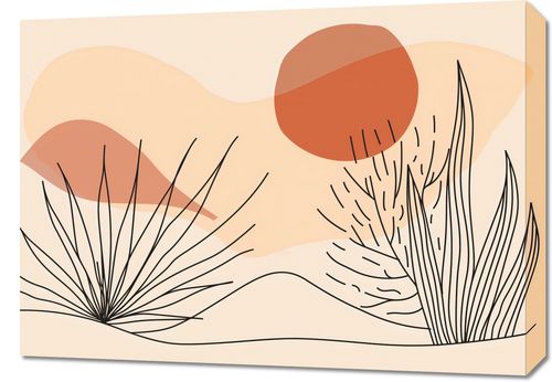 Obraz z serii boho zatytułowany Miękka Roślinność. Obraz przedstawia proste, lecz eleganckie rośliny pustynne na tle abstrakcyjnych, miękkich form i kolorów. Całość kompozycji opiera się na spokojnych odcieniach beżu, brązu oraz głębokiego terrakoty, co przywodzi na myśl ciepło i suchość pustynnego krajobrazu. Ten obraz świetnie sprawdzi się w wnętrzach o neutralnej kolorystyce, dodając im charakteru i ciepła. Idealnie nadaje się do salonu, przestrzeni wypoczynkowych lub biura, gdzie wprowadzi elementy natury i harmonii.