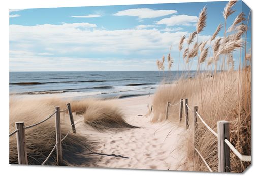Obraz z serii pejzaże zatytułowany Nadmorski Most to tytuł tej zapierającej dech w piersiach ilustracji, która przemawia do duszy miłośnika morza. Delikatne trawy morskie tańczą w rytmie przybrzeżnego wiatru, a spokojne fale delikatnie docierają do złocistego piasku, tworząc melodię naturalnego spokoju. Nieskazitelnie błękitne niebo przechodzące w pastelowe odcienie na horyzoncie dodaje głębi i przestrzeni, tworząc obraz idealny do umieszczenia w przestrzeniach, które celebrują ciszę i kontemplację. Ten obraz będzie wyjątkowym dodatkiem do każdej plażowej chaty, salonu nadmorskiego domu, a nawet biura, przypominając o nieskończonej przestrzeni i wolności, jaką oferuje morze.