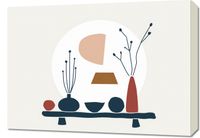 Obraz z serii boho zatytułowany Naturański Stół. Obraz to subtelna i uporządkowana prezentacja natury w stylizowanej, niemal scenicznej formie. Abstrakcyjne kształty w ciepłych i stonowanych kolorach przedstawiają wazony i rośliny na tle geometrycznych form przypominających wschód i zachód słońca. Kompozycja na neutralnym tle łączy sztukę z naturą w spójnym, współczesnym stylu. Dzieło to będzie idealnym uzupełnieniem wnętrz, w których ceniona jest prostota, ale jednocześnie szukających ciepła i naturalności. Może znaleźć miejsce w domowych salonach, jadalniach, lub jako urokliwy element w przestrzeniach biurowych, wniosąc odrobinę uroku i artystycznego nastroju.