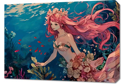 Obraz z serii wnętrza zatytułowany Nimfa Oceanu przedstawia eteryczną postać kobiecą zatopioną w głębinach morskich. Jej długie, różowe włosy płyną z prądem wody, mieszając się z otaczającymi ją kwiatami i roślinami morskimi. Czerwone ryby dodają akcentu kolorystycznego, tworząc wrażenie ruchu i życia pod wodą. Postać nimfy, z jej delikatną sylwetką i spokojnym wyrazem twarzy, stanowi centralny punkt kompozycji, sugerując spójność człowieka z naturą. Ten oniryczny obraz świetnie sprawdzi się jako element dekoracyjny w przestrzeniach relaksacyjnych takich jak spa, salony piękności, a także jako inspirująca dekoracja do pokoju osobistego lub medytacyjnego, zachęcając do refleksji i wyciszenia.