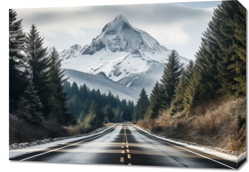 Obraz z serii pejzaże zatytułowany Odważna Podróż, przedstawia majestatyczną górę wyłaniającą się z pośród ciemnozielonych drzew iglastych, które wyznaczają drogę prowadzącą w kierunku jej śnieżnego szczytu. Siła i niezachwiana postawa góry w połączeniu z miękkimi konturami puchowych chmur nad nią tworzą doskonałą równowagę między wytrwałością a delikatnością. Czarna, wilgotna nawierzchnia drogi, rozświetlona światłem odbijającym się od jej wilgotnej powierzchni, prowadzi wzrok obserwatora wprost do serca dzikiej przyrody. Kontrast między ciemnymi drzewami a bielą śniegu dodaje dziełu głębi i tajemniczości. Ten obraz będzie idealnym dodatkiem do wnętrz o tematyce przygodowej i eksploracyjnej, jak również doskonałym wyborem dla przestrzeni biurowych firm turystycznych lub agencji podróżniczych, gdzie może inspirować i przypominać o majestacie i pięknie niezbadanych zakątków świata.