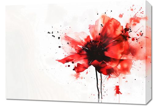 Obraz z serii abstrakcja zatytułowany Płynna Akwarela. Na obrazie przedstawiony jest kwiat w stylu akwarelowym, z dominującą czerwoną paletą barw, która przechodzi w mocne akcenty czerni w centrum kwiatu. Obraz ma dynamiczny i spontaniczny charakter, co podkreślają rozbryzgi i krople farby rozchodzące się wokół kwiatu. Przypomina to efekt plamy, który dodaje kompozycji artystycznego wyrazu i energii. Kontrast między delikatnymi czerwieniami a głęboką czerń centrum kwiatu przyciąga wzrok i czyni obraz bardzo wyrazistym. Tło jest jasne z subtelnie zaznaczonymi plamami, co dodatkowo akcentuje dramatyzm i piękno przedstawionego kwiatu.