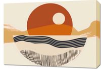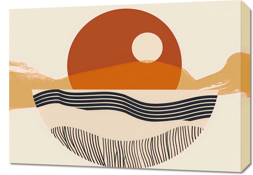 Obraz z serii boho zatytułowany Pół na Całość. Obraz przedstawia uproszczony, geometryczny krajobraz, w którym słońce jest głównym bohaterem, stanowiąc centralny punkt kompozycji. Jego okrągły kształt dominuje na tle abstrakcyjnych wzgórz i falujących linii, które mogą przypominać wzburzone morze lub piaszczyste wydmy. Kolorystyka plakatu to spokojna paleta ciepłych odcieni pomarańczu, beżu i czerni, która nadaje dziełu głębi i kontrastu.Ten obraz będzie wspaniałym dodatkiem do wnętrz urządzonych w ciepłych, ziemistych barwach, gdzie może dodać nowoczesnego charakteru. Idealnie sprawdzi się jako punkt centralny w przestrzeniach, które korzystają z naturalnego światła, takich jak salony, gabinety czy przestronne hole.