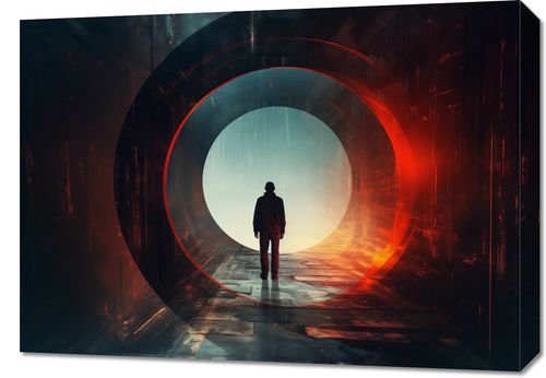 Obraz z serii pop art zatytułowany Portal do Świata. Obraz przedstawia tajemniczą postać stojącą na końcu długiego, ciemnego korytarza, który prowadzi do jaskrawo oświetlonego, okrągłego otworu. Otoczenie jest industrialne, z elementami wyglądającymi na zużyte i zardzewiałe, co sugeruje opuszczoną lub dystopijną przestrzeń. Czerwono-neonowe akcenty wzdłuż korytarza tworzą wrażenie głębi i podkreślają centralną perspektywę. Światło emanujące z końca tunelu jest jasne i kontrastujące, co może symbolizować nadzieję, nieznane lub nowy początek. Ten obraz mógłby znaleźć swoje miejsce w nowoczesnych przestrzeniach życiowych lub komercyjnych, które chcą wprowadzić elementy science fiction lub skłaniać do refleksji nad przyszłością i możliwościami, które ona przynosi.