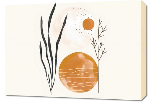 Obraz z serii wnętrza zatytułowany Przebłysk. Obraz prezentuje abstrakcyjną kompozycję o spokojnej, naturalnej kolorystyce, z dominującymi odcieniami beżu, pomarańczu i czerni. Centralne miejsce zajmują dwa okręgi, które mogą symbolizować słońce i księżyc lub inne astronomiczne ciała, z subtelnymi detalami przypominającymi krążki planetarne lub satelity. Obok nich znajdują się stylizowane rośliny lub trawy, które swoją smukłą formą i ciemnym kolorem tworzą kontrast wobec jaśniejszego tła. Dodatkowy element graficzny w postaci gałęzi z prostymi liniami przypomina drzewo lub krzew, dodając kompozycji organicznego charakteru. Całość jest utrzymana w stylistyce minimalizmu, z delikatnymi teksturami i rozpryskami, które nadają dziełu lekkości i nowoczesnego wyglądu. Ograniczona paleta barw oraz proste formy sugerują spokój i harmonię, co czyni obraz odpowiednim dla przestrzeni, które mają za zadanie inspirować do wyciszenia i refleksji.