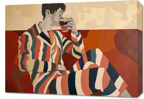 Obraz z serii abstrakcja zatytułowany Przerwa Aby Odetchnąć. Prezentuje postać mężczyzny w paskowanym szlafroku, zatopionego w degustacji filiżanki herbaty. Stylizacja grafiki nawiązuje do modernistycznej estetyki z użyciem geometrycznych kształtów i ograniczonej palety barw, co nadaje scenie spokojny i zrelaksowany nastrój. Ciepłe odcienie czerwieni i brązów w tle kompozycji podkreślają atmosferę intymności i domowego ciepła. Ten obraz idealnie wpasuje się w przestrzenie takie jak salon, biblioteka, czy przytulne zakątki do czytania i odpoczynku. Może także stanowić inspirujący akcent w kawiarniach lub herbaciarniach, gdzie zachęca do chwili oddechu i cieszenia się chwilą.