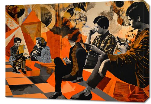 Obraz z serii pop art zatytułowany Przestrzeń Do Dialogu. Prezentuje grupę ludzi w stylizowanych retro ubraniach, zanurzonych w konwersacji i zatopionych w swoich myślach, co sugeruje głębię ludzkiego połączenia i introspekcji. Tło plakatu to geometryczne i abstrakcyjne formy w odcieniach pomarańczu, żółci i brązu, nawiązujące do lat 60. i 70. XX wieku, wprowadzając elementy vintage do nowoczesnej przestrzeni. Postacie wydają się pochłonięte rozmową, a ich pozy i gesty odzwierciedlają osobistą wymianę i komunikację. Obraz ten jest idealny do kawiarni, salonów, bibliotek, lub jako inspirujący akcent w domowych biurach, zachęcając do refleksji i twórczego dialogu.