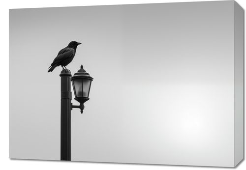 Obraz z serii wnętrza zatytułowany Samotny Postój Kruka. Prezentuje on sylwetkę kruka spoczywającego na klasycznej latarni ulicznej, uchwyconą w monochromatycznej palecie szarości. Ten spokojny, lecz sugestywny obraz jest symbolem refleksji i tajemnicy, doskonale wpisując się w klimat współczesnych przestrzeni miejskich. Praca ta z pewnością stanie się wyrazistym dodatkiem do nowoczesnych wnętrz, takich jak lofty czy minimalistyczne salony, a także wniesie element zastanowienia do przestrzeni publicznych takich jak galerie, kawiarnie i biblioteki, gdzie odosobnienie miesza się z miejskim zgiełkiem.