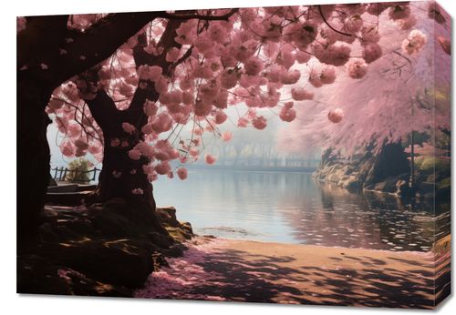 Obraz z serii motywy wschodnie zatytułowany Spokój Sakury przenosi nas do spokojnego zakątka, gdzie rozkwitłe drzewa wiśni tworzą bajkowy baldachim nad lśniącym jeziorem. Subtelna gra światła i cienia na delikatnych różowych płatkach w połączeniu z łagodnym odbiciem wody tworzy atmosferę spokoju i kontemplacji. Ta scena jest synonimem wiosennej odnowy i piękna, która z łatwością wniesie element romantycznej natury do każdego wnętrza. Idealnie odnajdzie się w przestrzeniach wypoczynkowych, pokojach gościnnych, czy salonach spa, dodając im uroku i subtelnej elegancji.