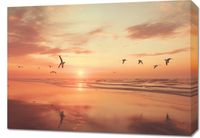 Obraz z serii pejzaże zatytułowany Spokojna Przystań przedstawia idylliczny wschód słońca nad morzem, gdzie złociste promienie światła tańczą po delikatnie falującej powierzchni wody. Sylwetki mew unoszących się na ciepłym powietrzu dodają uczucia wolności i bezkresu. Rozmyte odbicia ptaków na mokrym piasku nadmorskim wzbudzają uczucie spokoju i kontemplacji. Ten obraz jest kwintesencją ukojenia, idealny do wnętrz o tematyce nadmorskiej, czy to w prywatnych rezydencjach pragnących złapać oddech od miejskiego zgiełku, jak i w przestrzeniach wellness, spa, czy hotelowych lobby, gdzie głównym celem jest relaks i odprężenie.