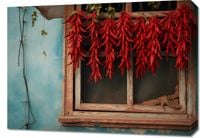 Plakat z serii wnętrza zatytułowany Szczypta Chilli - malowniczy obraz pełen kulturowego bogactwa, przedstawiający bujne kiście czerwonych papryczek chili, suszące się na drewnianej ramie okna. Kontrastujące kolory - żywe czerwienie chili na tle pastelowo-niebieskiej ściany - przyciągają wzrok i oddają esencję wiejskiego życia. Przytulne okno i zardzewiała siatka nadają scenie autentyczny, wiejski charakter, a delikatne odcienie i tekstury ściany dodają głębi i ciepła. Obraz ten jest hołdem dla prostoty i naturalnego piękna codziennego życia, idealnym do wnętrz, które pragną wnieść element tradycyjnego rzemiosła i natury.