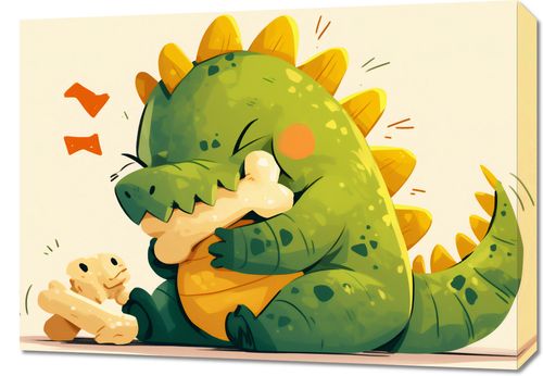 Obraz z serii wnętrza zatytułowany Uroczy Dinozaur. Przedstawia zabawną i uroczą ilustrację zielonego, kreskówkowego dinozaura, który wygląda na szczęśliwego i beztroskiego. Dinozaur ma duże, wyraziste oczy i szeroki uśmiech, a jego skóra pokryta jest jasnymi plamami i kropkami. Z wyglądu przypomina przyjaznego Tyranozaura. Jego małe ręce tulą kość, co może sugerować, że cieszy się z posiłku. Jego ogon i grzbiet zdobią charakterystyczne żółte kolce, które dodają mu komicznego charakteru. Tło jest jasne i neutralne, co sprawia, że postać dinozaura jest głównym punktem zainteresowania. Obraz sprawia wrażenie ciepłego i przyjaznego, idealnego do dekoracji pokoju dziecięcego lub jako element dodający humoru i radości do każdej przestrzeni.
