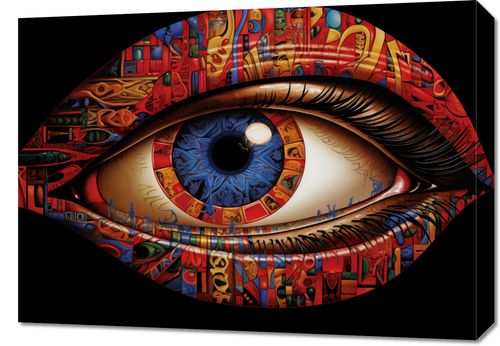 Obraz z serii abstrakcja zatytułowany W Oku Obserwatora. Ta złożona, surrealistyczna grafika przedstawia ludzkie oko, w którego tęczówce odzwierciedlone są bogate, abstrakcyjne i symboliczne wzory, przypominające fragmenty różnych dzieł sztuki. Barwne motywy w tęczówce mieszają się z intensywną czerwienią, żółcią i niebieskością, tworząc efekt kalejdoskopu kulturowych wpływów. Zadziwiająca szczegółowość pracy sugeruje głębię ludzkiego spojrzenia i różnorodność perspektyw, które możemy doświadczać poprzez sztukę. Obraz ten z pewnością zaintryguje i stanie się punktem centralnym każdej przestrzeni, szczególnie tam, gdzie sztuka i kreatywność są w cenie, jak studia artystyczne, galerie, czy nowoczesne salony.