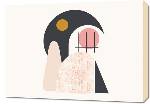 Obraz z serii boho zatytułowany Zakres Widoku.Obraz przedstawia abstrakcyjną kompozycję łączącą kształty zakrzywione i geometryczne, wykorzystującą miękką i spójną paletę kolorów. Dominujące kolory to czarny, odcienie różu, beż oraz akcent żółtego, tworząc poczucie równowagi i nowoczesnej estetyki. Kompozycja składa się z nakładających się form, w tym dużej czarnej figury z wycięciem koła, przez które prześwituje część różowego koła, oraz żółtego koła umieszczonego w obszarze czarnym, co może sugerować ciało niebieskie typu księżyc lub słońce. Obecne są również elementy fakturalne, dodające głębi i intrygi jednemu z kształtów, a proste linie przecinają różowe koło, przyczyniając się do wizualnego zainteresowania dziełem. Całość kompozycji przekazuje spokojne i współczesne wrażenie, prawdopodobnie czerpiąc inspirację z natury i sztuki abstrakcyjnej.