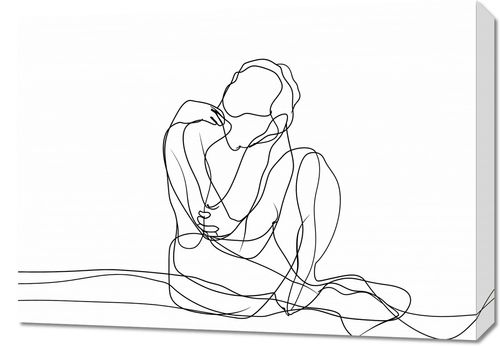 Obraz z serii wnętrza zatytułowany Zgarbienie. Obraz przedstawia minimalistyczny, jednoliniowy rysunek siedzącej postaci. Jest to przykład sztuki line art, gdzie cała forma jest zredukowana do jednej, ciągłej linii, która tworzy zarówno zewnętrzny kontur postaci, jak i wewnętrzne detale ciała i ubioru. Postać wydaje się zatopiona w myślach, z głową opartą na dłoni, co sugeruje introspekcję lub głębokie zamyślenie. Prosta elegancja tej pracy polega na jej zdolności do przekazywania emocji i postawy bez nadmiernego skomplikowania formy. Czyste tło podkreśla subtelność i skupienie kompozycji. Taki obraz może idealnie wpasować się w nowoczesne, ascetyczne wnętrza, gdzie może stanowić spokojny, ale wyrazisty akcent artystyczny.