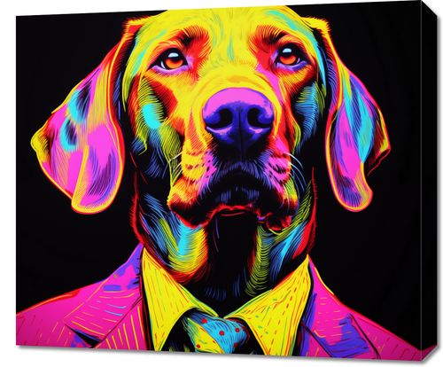 Obraz z serii pop art zatytułowany Barwna Osobowość. Ten dynamiczny portret przedstawia psa w stylu neonowym pop-artu, ubranego w elegancki garnitur z kolorowym krawatem. Intensywne, żywe barwy na czarnym tle wydobywają głębię spojrzenia i dostojność postawy psa, co nadaje temu dziełu sztuki wyjątkowy charakter. Wzór i paleta kolorów sprawiają, że obraz ten jest idealny dla współczesnych przestrzeni biurowych, designerskich mieszkań oraz galerii sztuki, które pragną dodać swojemu wnętrzu odrobinę odwagi i wyrazistości.