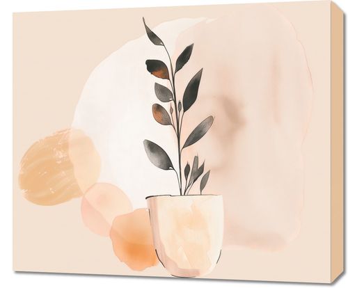 Obraz z serii wnętrza zatytułowany Doniczkowy Kolor. Obraz przedstawia minimalistyczną i stylową kompozycję roślinną na delikatnym, pastelowym tle. Centralnym punktem jest elegancka, czarno-brązowa gałązka z liśćmi w stonowanej kolorystyce, umieszczona w jasnym, beżowym doniczce o subtelnych odcieniach i delikatnym cieniowaniu. Tło składa się z miękkich, organicznych plam w odcieniach kremu, beżu i ciepłego brązowego, które tworzą efekt akwarelowy. Całość jest utrzymana w spokojnej, relaksującej palecie barw, co sprawia, że obraz ten idealnie nadaje się do przestrzeni, gdzie chcemy wprowadzić element spokoju i harmonii, jak salon czy sypialnia. Delikatność i prostota wzoru podkreślają nowoczesny charakter tego dzieła, jednocześnie zachowując ponadczasową elegancję.