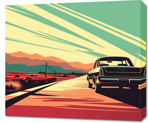 Obraz z serii pop art zatytułowany Droga przez Pustynię. Obraz przedstawia vintage samochód, prawdopodobnie model z lat 60., zaparkowany na pustynnej drodze z widokiem na zachód słońca. Złote i ciepłe odcienie nieba kontrastują z głębokimi cieniami pustyni, dodając głębi i dramatyzmu kompozycji. Design nawiązuje do złotej ery amerykańskich podróży samochodowych, przypominając o wolności i odkrywaniu nieznanych zakątków kraju. Idealnie sprawdzi się jako dekoracja w przestrzeniach inspirowanych vintage, takich jak retro kawiarnie, salony gier, domowe biblioteki, a także jako centralny punkt w salonie dla miłośników stylu mid-century modern.