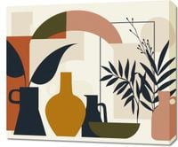 Obraz z serii minimalistyczne zatytułowany Formy Stylu. Grafika ta przedstawia abstrakcyjne kompozycje różnych form geometrycznych i roślin. Centralne miejsce zajmują stylizowane wazony i doniczki w ciepłych odcieniach brązu, żółci i czerni, które są przeplatają się z roślinami w odcieniach zielonym i czarnym. Tło składa się z nieregularnych bloków kolorów w stonowanych odcieniach beżu, pomarańczy i szarości, tworzących spokojny i uporządkowany układ.Ten obraz będzie doskonale komponować się we wnętrzach utrzymanych w nowoczesnym, minimalistycznym stylu, gdzie dominują czyste linie i neutralna paleta kolorów.