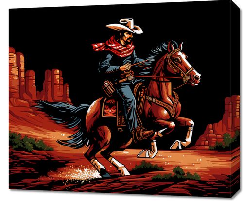 Obraz z serii pop art zatytułowany Galop przez Prerię. Dynamiczna ilustracja przedstawia kowboja w tradycyjnym stroju, galopującego na wiernym rumaku przez pustynny krajobraz. Żywe kolory i detaliczne wykonanie postaci oraz konia, a także skaliste formacje i kaktusy w tle, nadają scenie autentycznego ducha zachodniej przygody. Stylizacja graficzna łączy elementy klasycznych westernów z nowoczesną estetyką komiksu, co sprawia, że obraz ten idealnie wpisuje się w dekoracje wnętrz inspirowane amerykańskim folklorem lub jako ozdoba domowego kina dla miłośników filmów o tematyce kowbojskiej.