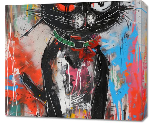 Obraz z serii abstrakcja zatytułowany Gburowaty Kiciak to odważne, street artowe przedstawienie czarnego kota z intensywnymi, czerwonymi oczami. Postać kota, zarysowana grubymi, dynamicznymi liniami, wyróżnia się na tle żywego, kolorowego graffiti. Dzieło łączy w sobie surowość miejskiego stylu z komicznym przedstawieniem zwierzęcia, co nadaje mu niepowtarzalny charakter. Drobne białe akcenty na sierści kota oraz wyraziste spojrzenie tworzą efekt, który przyciąga i utrzymuje wzrok obserwatora. Ten obraz, pełen energii i miejskiego ducha, doskonale odzwierciedla współczesną kulturową estetykę i będzie stanowił wyrazisty element dekoracyjny w nowoczesnych przestrzeniach takich jak loftowe apartamenty, kawiarnie i przestrzenie kreatywne.