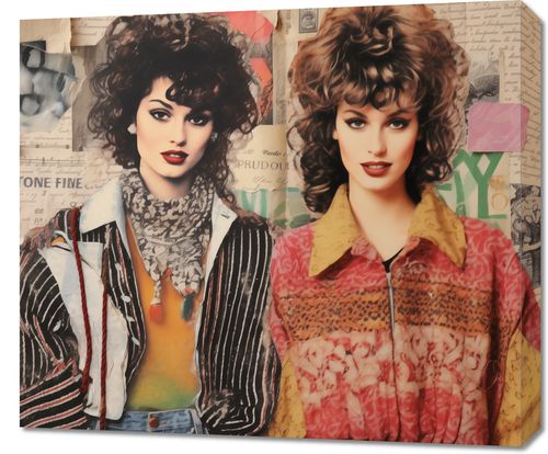 Obraz z serii pop art zatytułowany Ikony Stylu'80. Na tym nostalgicznie inspirowanym dziele sztuki widzimy dwie kobiety ubrane w odzież z lat 80., z charakterystycznymi, bujnymi fryzurami i wyrazistym makijażem. Ich postacie zostały umieszczone na tle kolażu z epoki, wypełnionego fragmentami starych gazet, ręcznych pism i ilustracji, co dodaje kontekstu historycznego i kulturowego. Silne kontrasty kolorystyczne i wyraźne linie twarzy podkreślają wyrazisty charakter obu postaci. Ten obraz to hołd dla mody i kultury lat 80., idealny dla przestrzeni, które pragną dodać retroflairu i odzwierciedlić ducha minionych dekad.