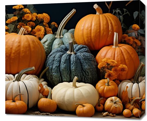 Obraz z serii natura zatytułowany Jesienne Urodzaje przedstawia bujne bogactwo jesieni. Centralne miejsce zajmuje soczysta, pomarańczowa dynia, królowa jesieni, otoczona przez różnorodność jej barwnych odmian. Niebieskawe i białe dynie tworzą wyjątkowy kontrast, a wszystko to uzupełnione jest przez złociste i burgundowe chryzantemy, które dodają kompozycji ciepła i głębi. Całość osadzona jest na tle w klasycznych, ciemnych odcieniach, co podkreśla elegancję i dojrzałość sezonu. Obraz ten idealnie wpasuje się w przestrzeń kuchni lub jadalni, dodając jej charakteru oraz ciepłego, domowego klimatu. Doskonale odnajdzie się także w przestrzeniach takich jak winiarnie czy restauracje serwujące sezonowe dania, gdzie podkreśli bogactwo i obfitość jesiennej palety smaków.