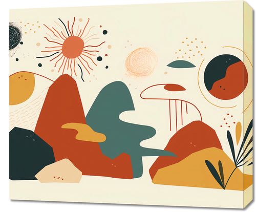 Obraz z serii minimalistyczne zatytułowany Kosmos Barw. To dynamiczne dzieło artystyczne łączy w sobie abstrakcyjne interpretacje kosmicznych ciał, jak planety i gwiazdy, z ziemskimi elementami krajobrazu. Zastosowana paleta barw to ciepłe odcienie czerwieni, pomarańczu i brązu kontrastujące z chłodnymi tonami szarości i błękitu, co nadaje kompozycji głębię i wizualne napięcie. Obraz ten idealnie wpasuje się w nowoczesne wnętrza poszukujące odrobiny abstrakcji i niebanalnych rozwiązań w dekoracji. Może być inspirującym akcentem w salonie, przestrzeni kreatywnej, a nawet w miejscach publicznych, takich jak galerie sztuki lub nowoczesne przestrzenie biurowe, przynosząc z sobą element refleksji i nowoczesności.
