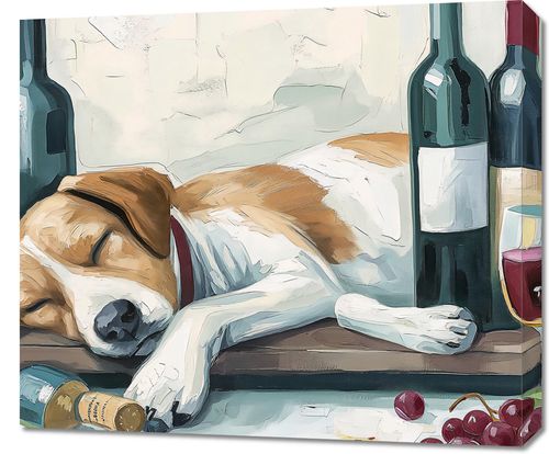 Obraz z serii abstrakcja zatytułowany Leniwe Popołudnie, przedstawia klimatyczną scenę wypoczynku. Na pierwszym planie widzimy spokojnie śpiącego psa, który wygodnie umieścił swoją głowę na drewnianej powierzchni, obok przewróconej butelki wina. Jego biało-brązowe umaszczenie kontrastuje z zielenią i burgundem butelek wina oraz rubinową głębią wina w szklance, dodając obrazowi domowej, przytulnej atmosfery. W tle delikatna tekstura popękanej ściany i dyskretnie rozmieszczone owoce nadają temu dziełu sztuki poczucie spokoju i domowego ciepła. Idealny do wzbogacenia wnętrza winiarni, salonu lub jako centralny punkt w przestrzeni, gdzie chcemy podkreślić miłość do zwierząt i chwile odpoczynku.