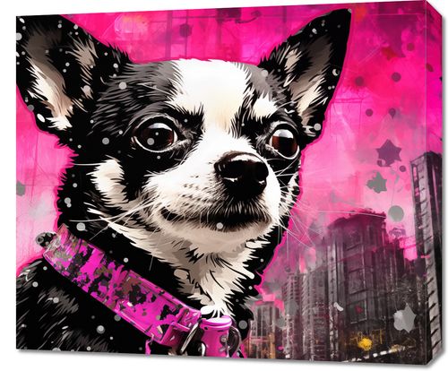 Obraz z serii pop art zatytułowany Mały Psiak o Dużej Duszy. Obraz przedstawia portret Chihuahua z intensywnym, przejmującym spojrzeniem. Pies ma charakterystyczną czarno-białą sierść, a jego oczy zdają się obserwować coś poza ramą obrazu. Ubrany jest w różową, stylową obrożę, co dodaje mu uroku. Tło w kolorze żywej magenty z elementami miejskiego krajobrazu nadaje całości miejski i nowoczesny charakter. Grafika łączy w sobie elementy realizmu z pop-artem, co sprawia, że jest ona żywa i dynamiczna. Ten obraz byłby idealnym dodatkiem do wnętrz o współczesnym designie, zwłaszcza dla miłośników zwierząt lub jako akcent kolorystyczny w modnym, miejskim mieszkaniu.