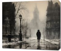 Obraz z serii wnętrza zatytułowany Mgła nad Londynem, przedstawia samotną sylwetkę przechadzającą się po mokrych, połyskujących bruku ulic, otoczoną przez klasyczne kamienice i latarnie uliczne, które rzucają cień na mglistą scenę. Szarości i sepii użyte w dziele podkreślają jego vintage charakter, a zarys wieży w tle przywołuje ikoniczny obraz Londynu. To dzieło sztuki idealnie wpasuje się w przestrzenie, gdzie chce się wywołać atmosferę tajemniczości i klasyki, takie jak biblioteki, salony w stylu retro, czy klasyczne biura prawnicze, zapewniając im wyrafinowany, metaforyczny akcent.